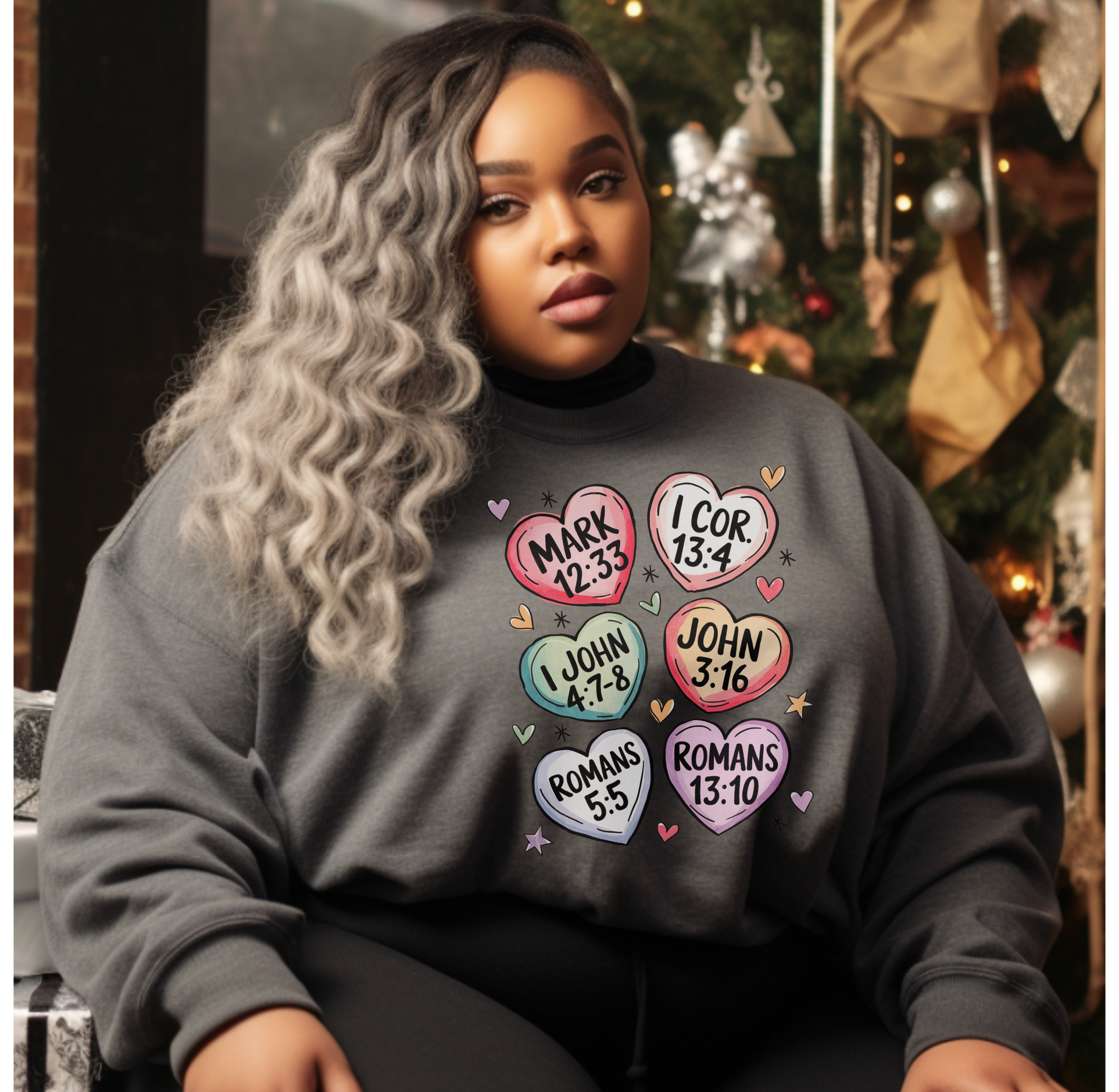 - Faithful Design: Decorated with heart motifs that incorporate crosses and other Christian symbols, this sweatshirt celebrates both earthly and heavenly love.