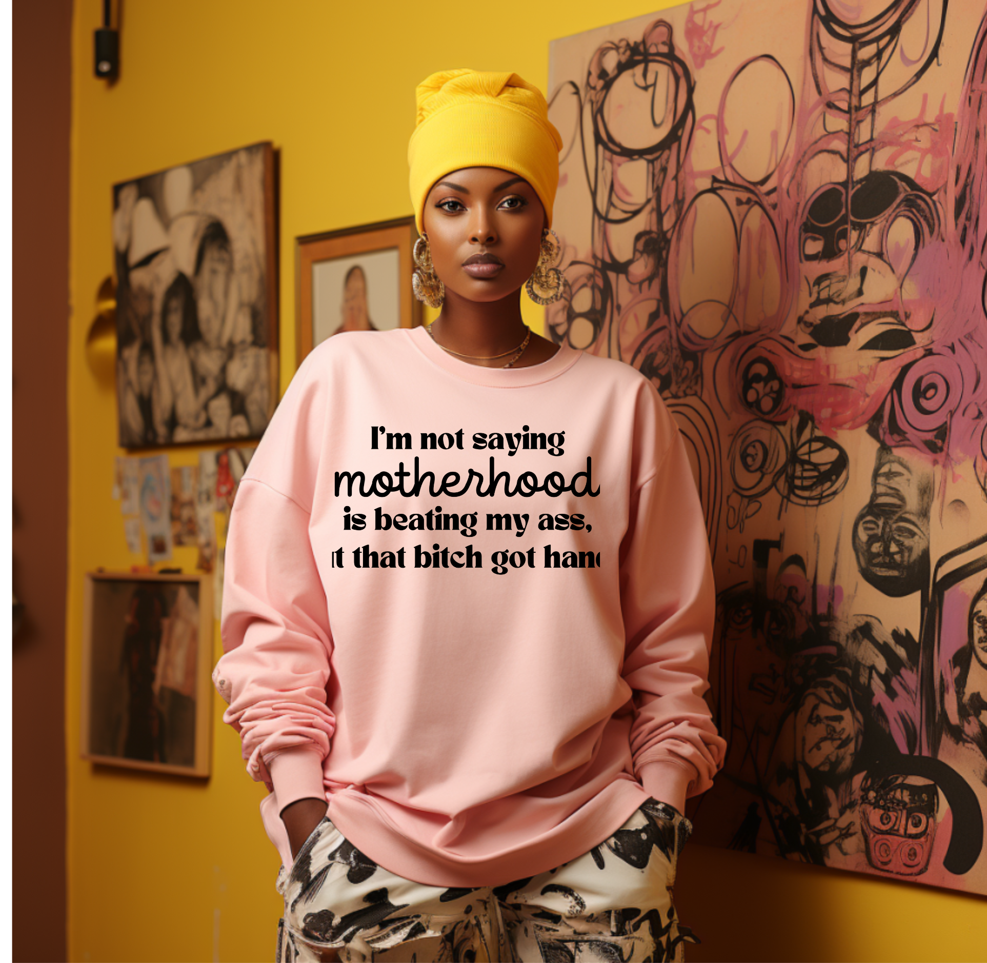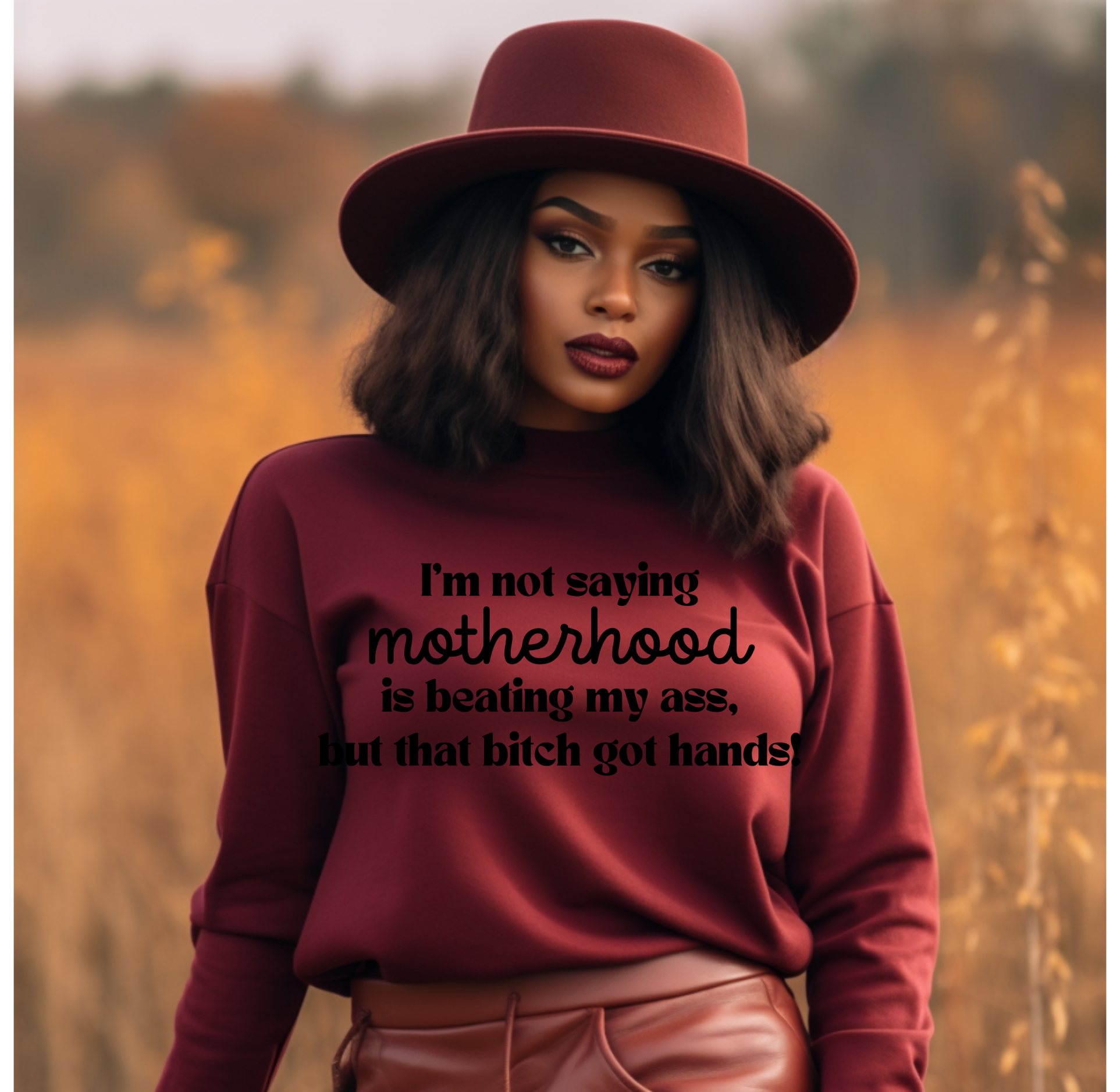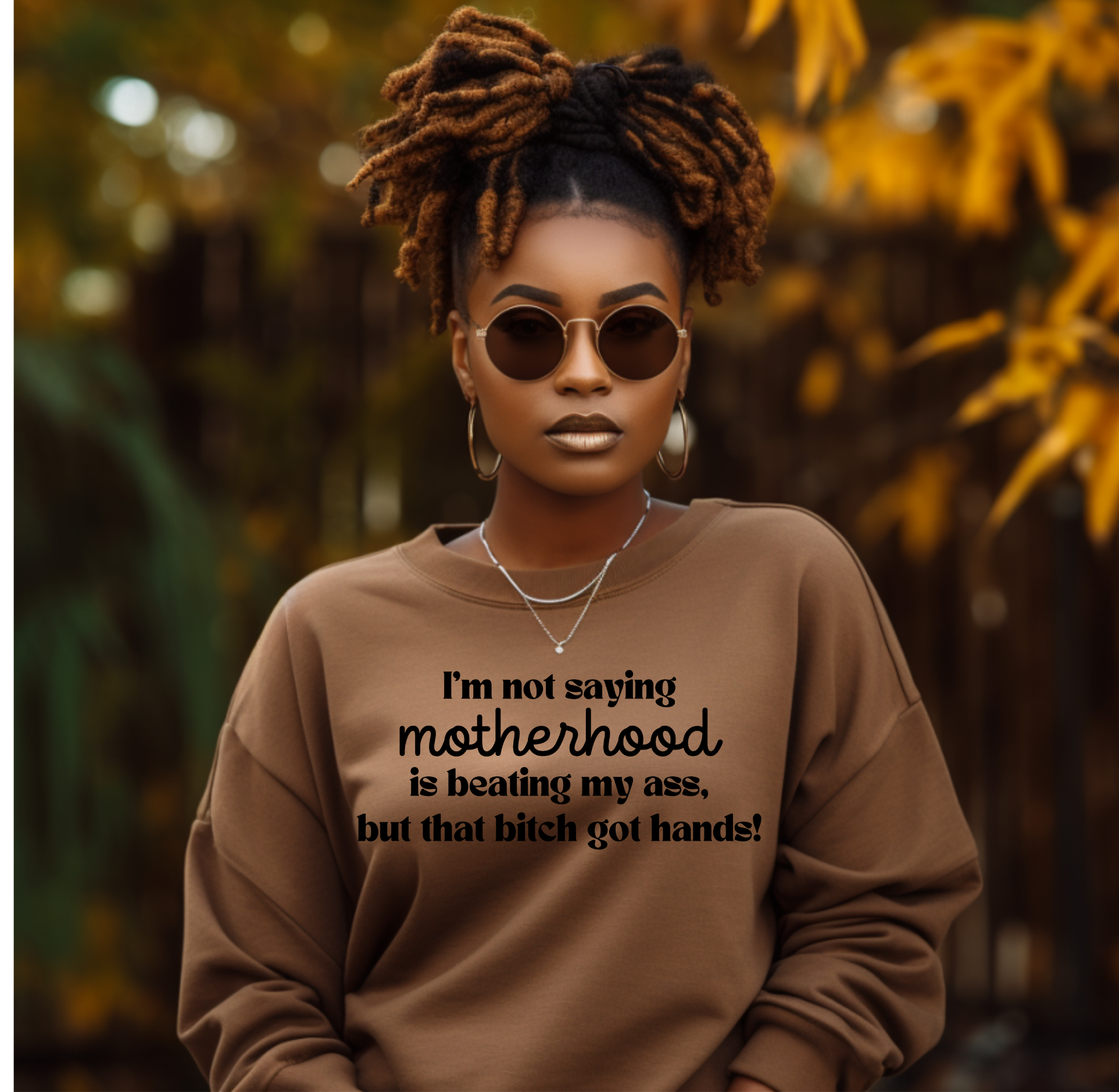 This sweatshirt isn't just a piece of clothing—it's a nod to the tireless efforts of mothers everywhere. Show off your motherhood pride and your sense of humor with our "Motherhood Got Hands" crewneck. It’s perfect for those days when you need to remind yourself of the superpowers you possess as a mom.