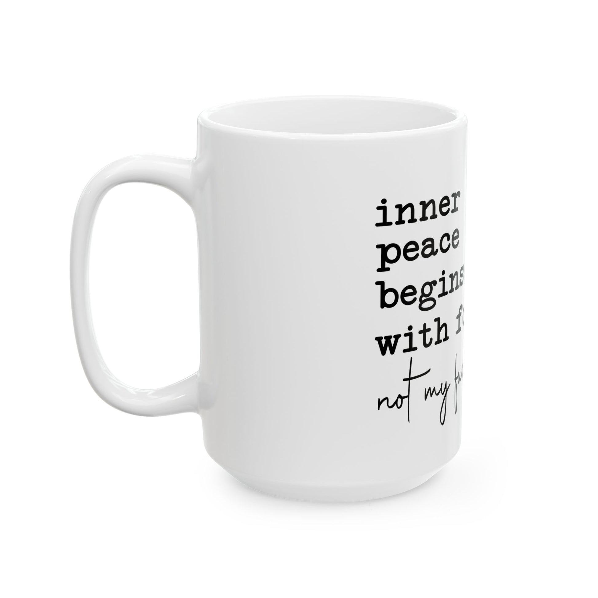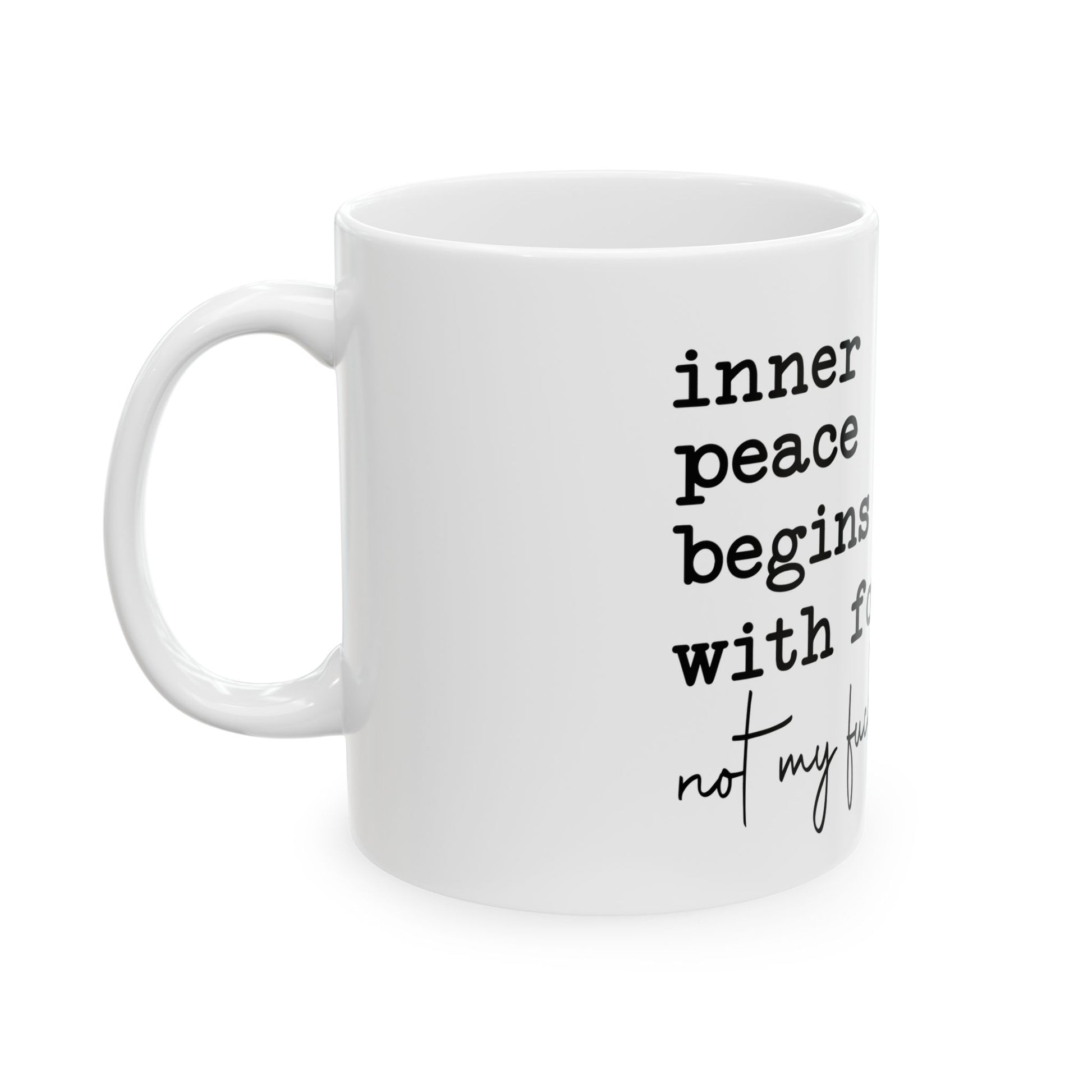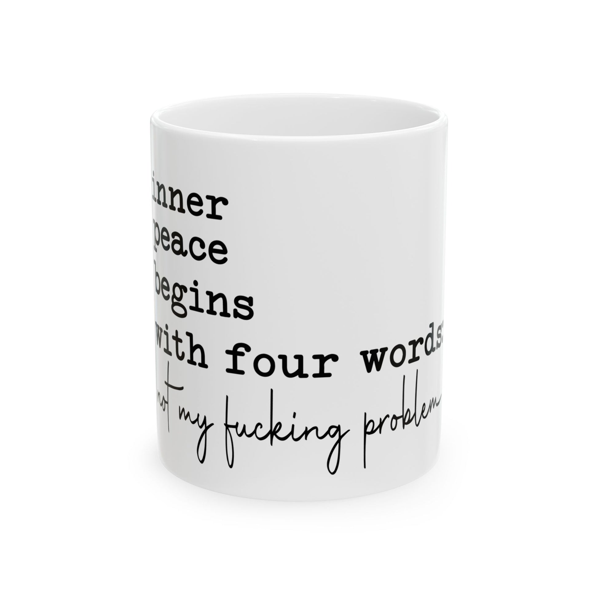 This ceramic mug with a glossy finish features the phrase 'inner peace begins with four words not my fucking problem.' It's perfect for those looking to add a touch of humor and sass to their morning routine. Ideal for coffee or tea lovers who appreciate a good laugh. Great for gifting on birthdays, holidays, or just because.